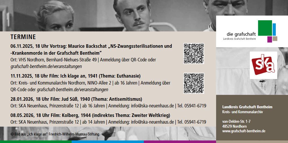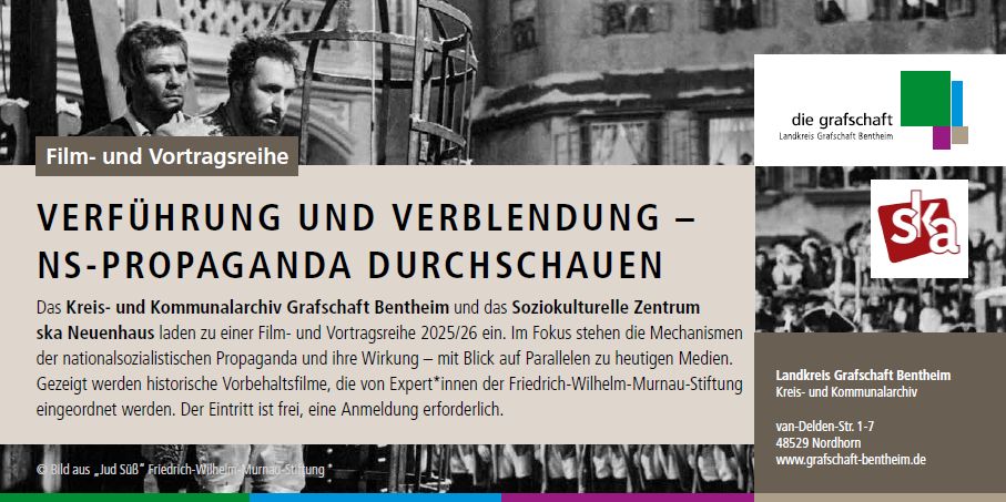 Das Kreis- und Kommunalarchiv Grafschaft Bentheim und das Soziokulturelle Zentrum ska in Neuenhaus bieten gemeinsam eine Film- und Vortragsreihe 2025/2026 zur Aufklärung über die Propaganda des nationalsozialistischen Regimes von 1933 bis 1945 an. Die Initiative für dieses Projekt ging von Norbert Voshaar und Daniela de Ridder aus. Über das „Institut für Kino und Filmkultur e.V.“ ist es möglich, drei Propagandafilme aus der NS-Zeit zu zeigen: Ich klage an (11.11.25 im Kreis- und Kommunalarchiv), Jud Süß (28.01.26 im ska Neuenhaus) und Kolberg (08.05.26 im ska Neuenhaus).