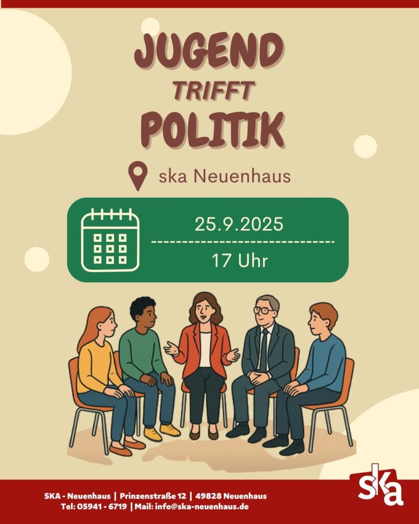 Ziel die­ser Ver­an­stal­tung ist es, den di­rek­ten Aus­tausch zwi­schen Ju­gend­li­chen aus der Samt­ge­mein­de Neu­en­haus und den po­li­ti­schen Vertreter*innen vor Ort zu för­dern. Für je­de Par­tei ist ein Vertreter/ ei­ne Ver­tre­te­rin ein­ge­la­den, sich in lo­cke­rer At­mo­sphä­re mit den Ju­gend­li­chen in den klas­si­schen Stuhl­kreis zu set­zen 🙂 Wir freu­en uns auch über ei­ne mög­li­che Teil­nah­me des Stadt­di­rek­tors und des stell­ver­tre­ten­den Stadtdirektors.
